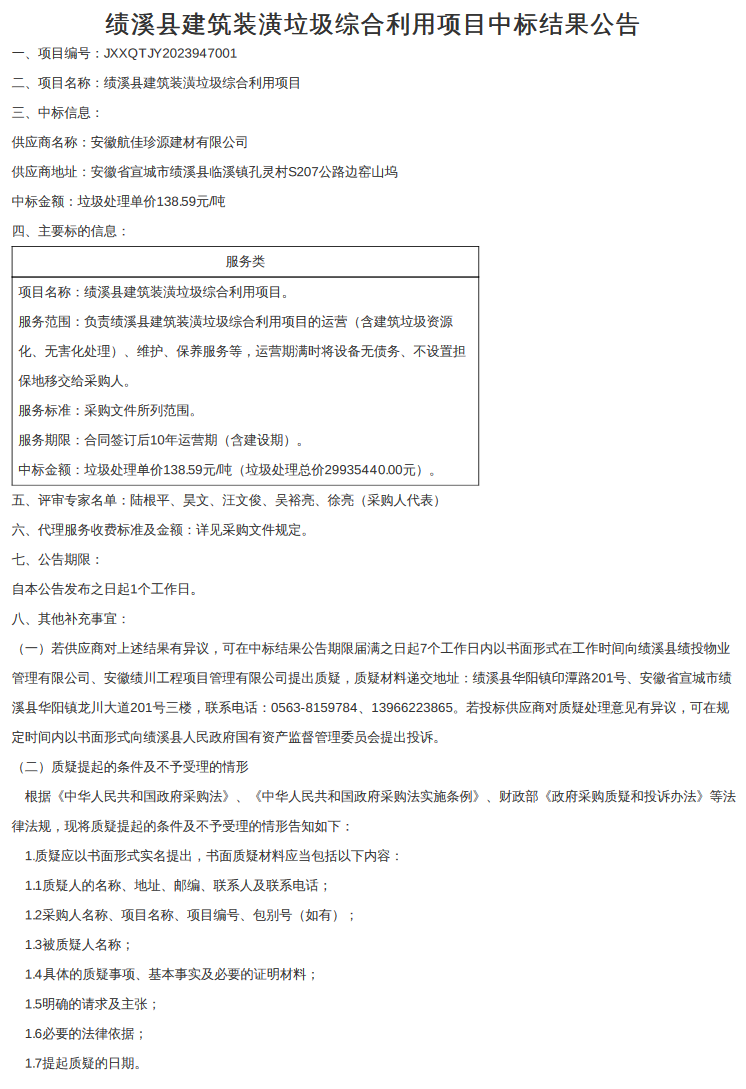 安徽省绩溪县建筑装潢垃圾综合利用项目中标结果公告,安徽航佳珍源建材有限公司中标,中标垃圾处理单价138.59元/吨,服务期限10年,含建设期,公示如下: